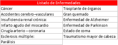 » Enfermedades graves: si el asegurado es diagnosticado por un médico legalmente autorizado y por primera vez, de alguna de las siguientes enfermedades (siempre y cuando hayan transcurrido por lo menos sesenta (60) días calendario desde el inicio de vigencia de la póliza).